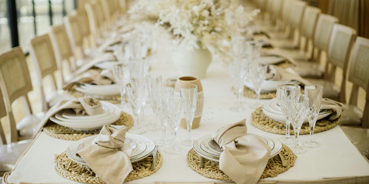 Consider specialty touches that add texture without clutter: rattan chargers, vintage silverware in unexpected finishes, mixed-height centerpieces, or a single statement floral arrangement. These details are what transform a “rental table” into a “designed table.”